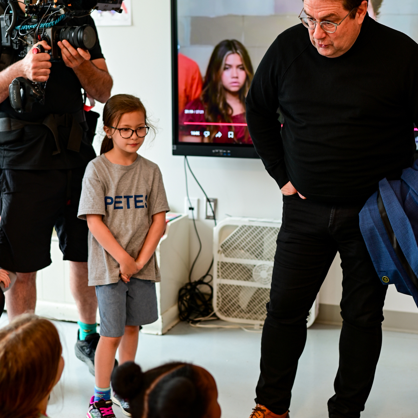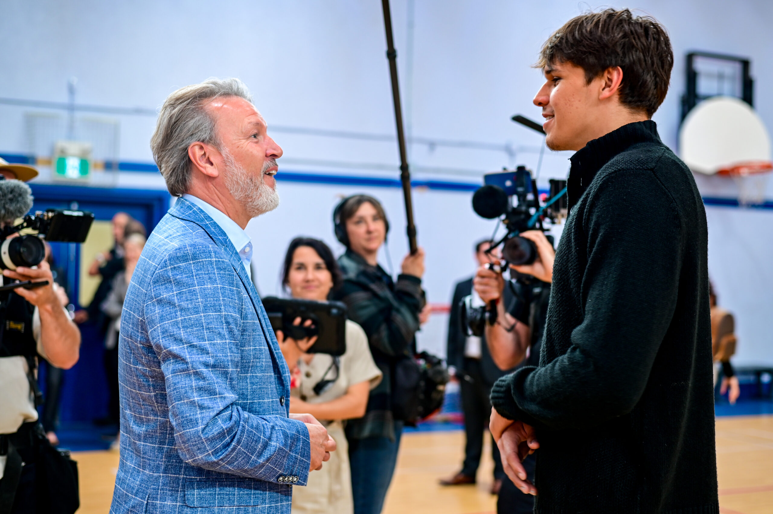 Luc Carrière, surintendant des bâtiments de la CSWQ et gestionnaire du projet d’agrandissement du Lab-École de PETES, a également offert une visite complète de la nouvelle aile aux invités d’honneur présents. Lors de la visite, M. Drainville s’est rendu dans l’une des nouvelles salles de classe pour échanger avec les jeunes élèves pendant leur pause déjeuner. Il a demandé aux élèves ce qui, selon eux, fait de PETES une excellente école et a reçu une avalanche de réponses. Le groupe s’est aussi arrêté au gymnase, où M. Drainville et le co-fondateur Ricardo Larrivée ont joué quelques paniers avec les élèves et ont également pu discuter avec le personnel.