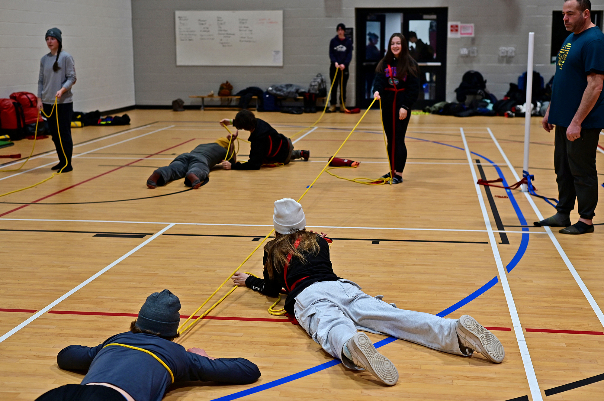 The certification is very comprehensive and covers everything from how to assess ice conditions, the stages of hypothermia, how to provide appropriate emergency aid and transportation, to knowing big gestural safety signals for communication with others who are out of earshot. Ice Safety and Rescue training started bright and early in the school gym, where the warmth allowed students to fully focus on absorbing all the skills before moving outside.