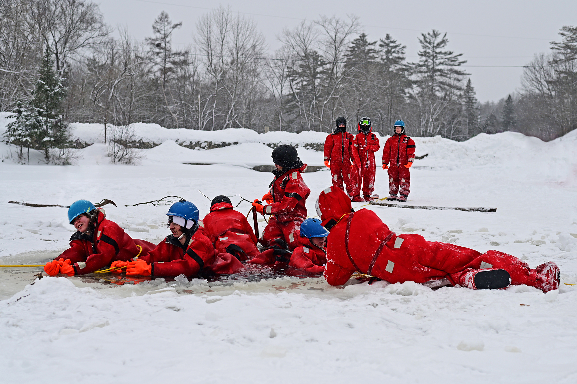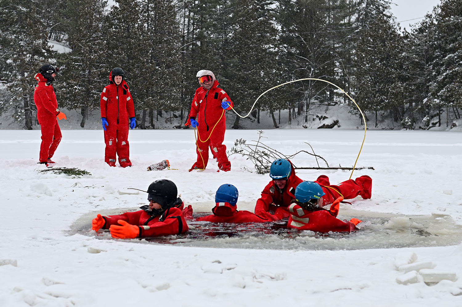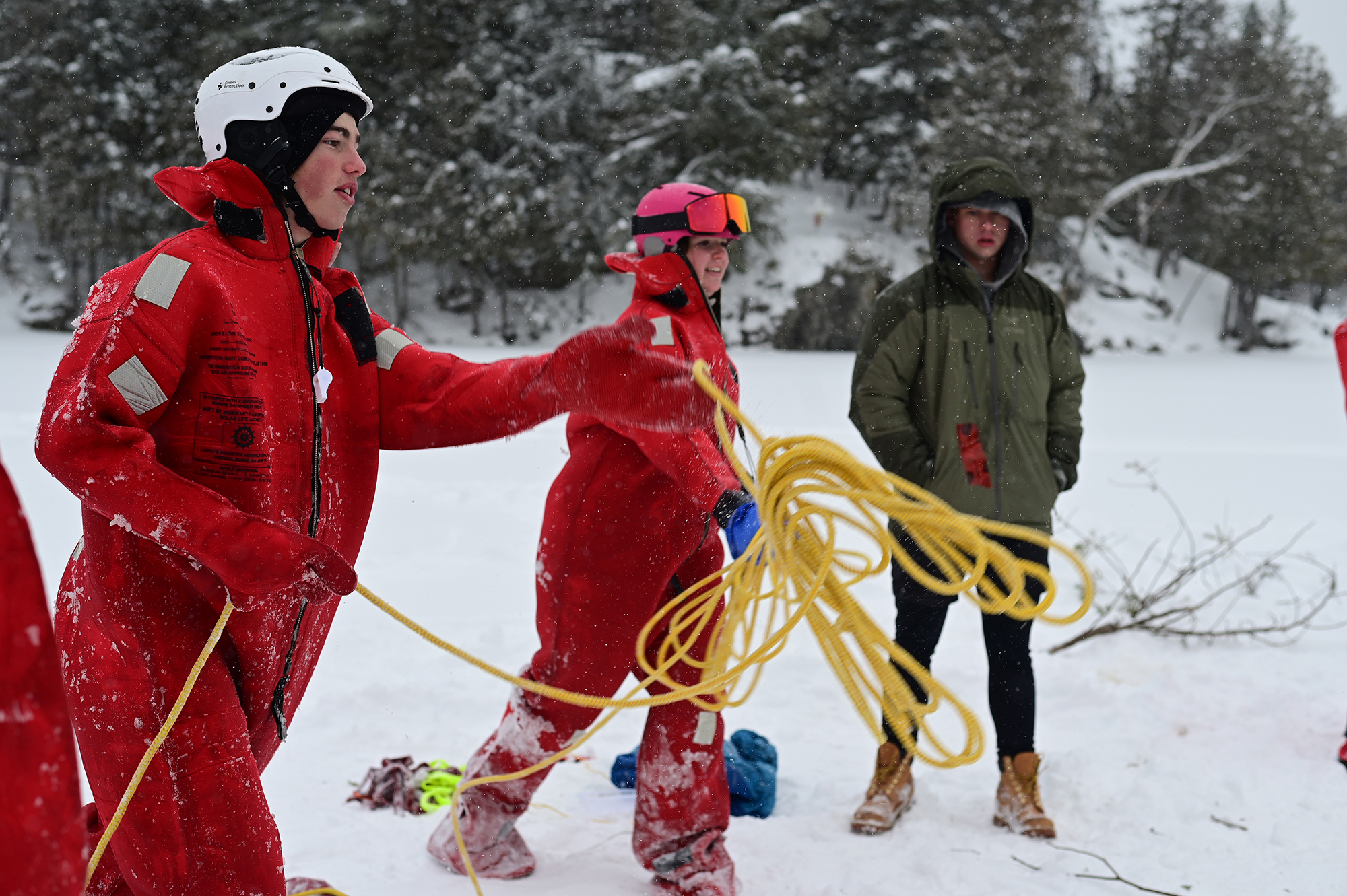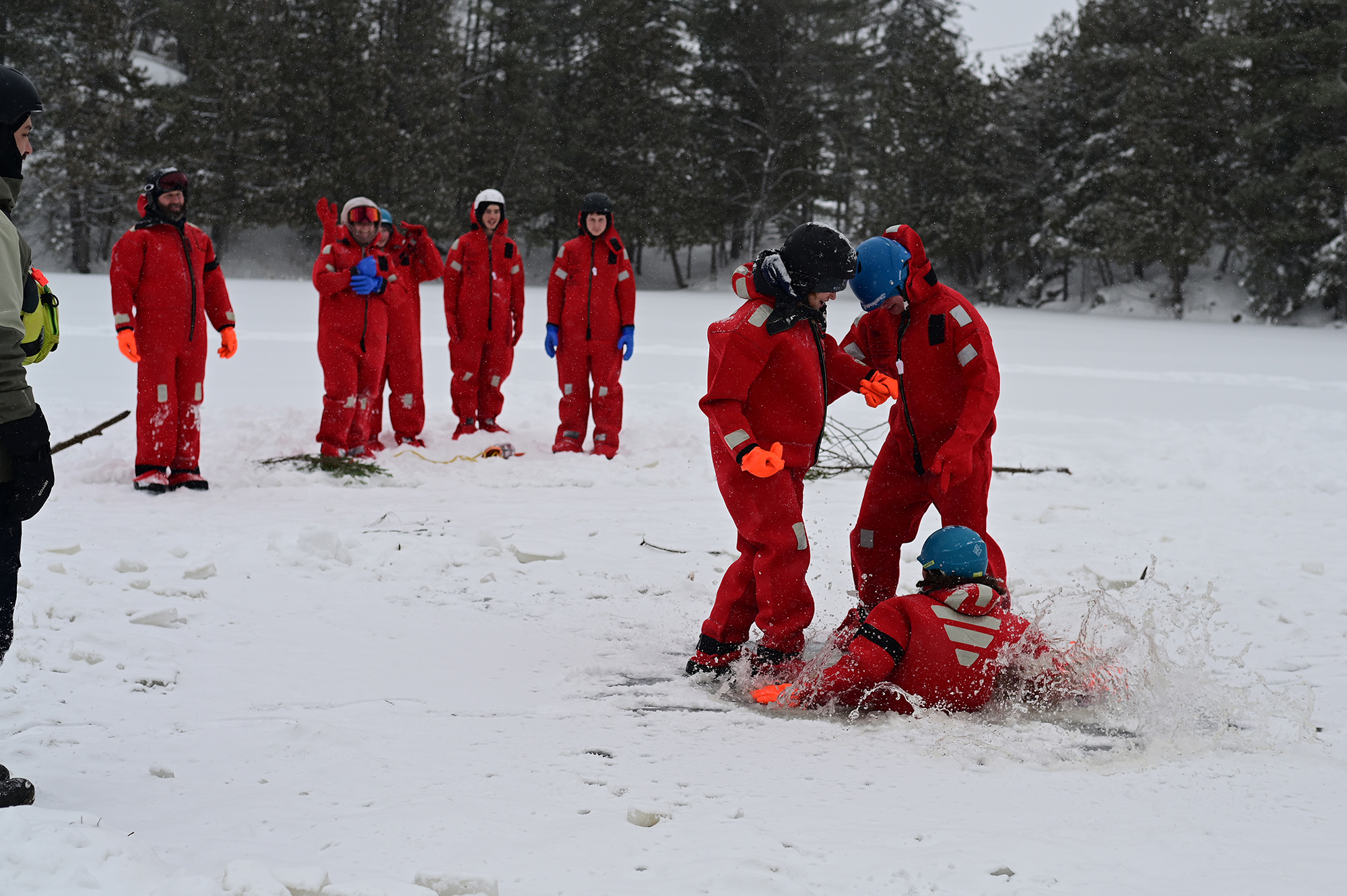Growing up in the Upper-Gatineau region, the students have a healthy respect for the ice, but empowered by the training, there were no signs of fear. With big smiles, they practised how to self-rescue as well as how to rescue others. They practiced with ice picks and with ropes, learning how to tie various safety knots, turn the rope into a harness, and several strategies for how to use rope in different rescue situations.