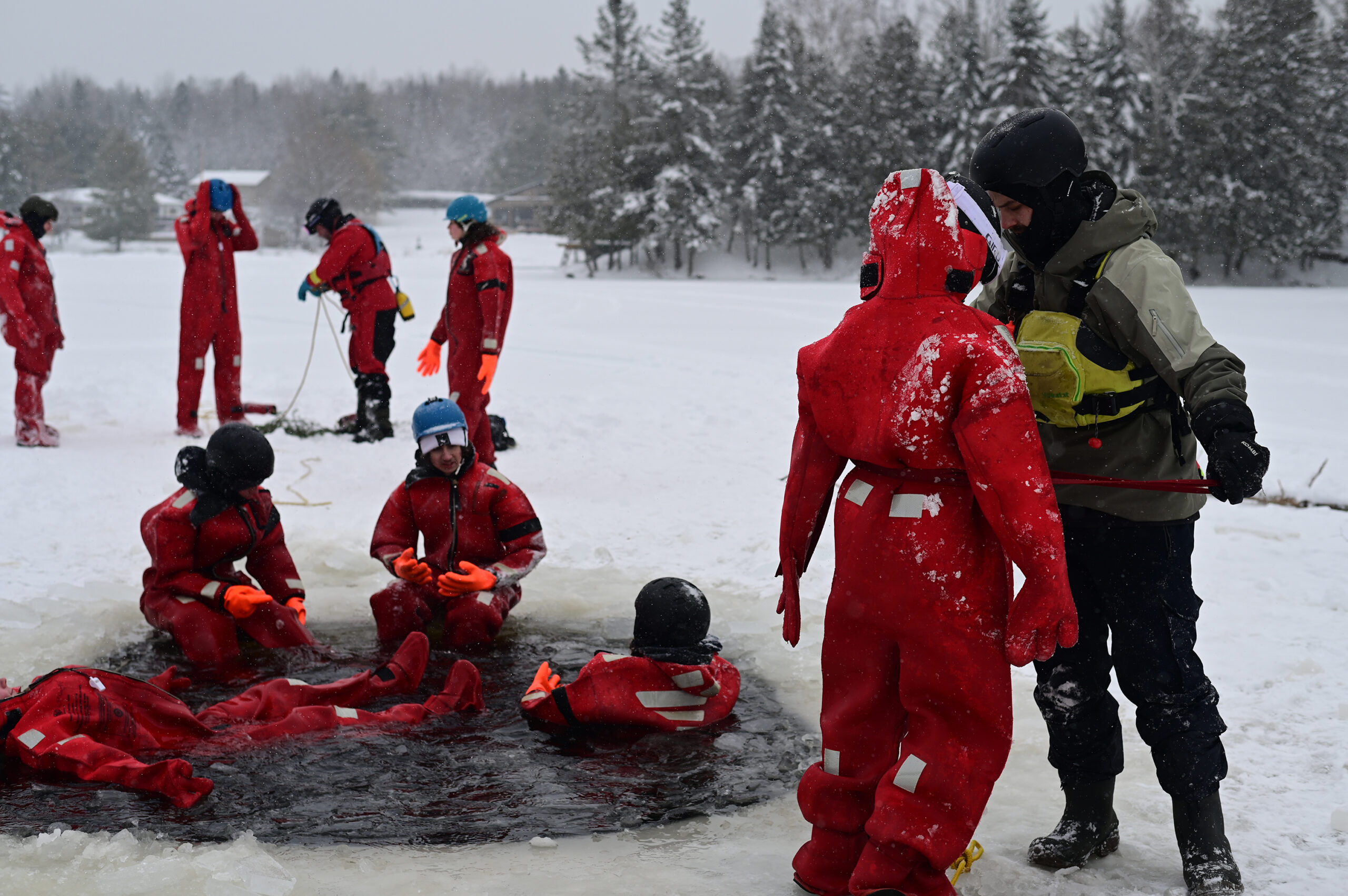 The certification was set up on the Gatineau River at the public warf, just a 13-minute walk from the school. For the students, the most exciting aspect of the certification was donning their red immersion suits, which kept them warm and buoyant, while practising hands-on training in the water.