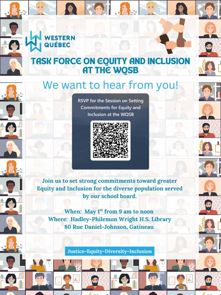 The Western Québec School Board’s JEDI Committee warmly invites parents/guardians, employees, commissioners, and members of the community to take part in an important collaborative development session focused on Equity, Diversity, and Inclusion.