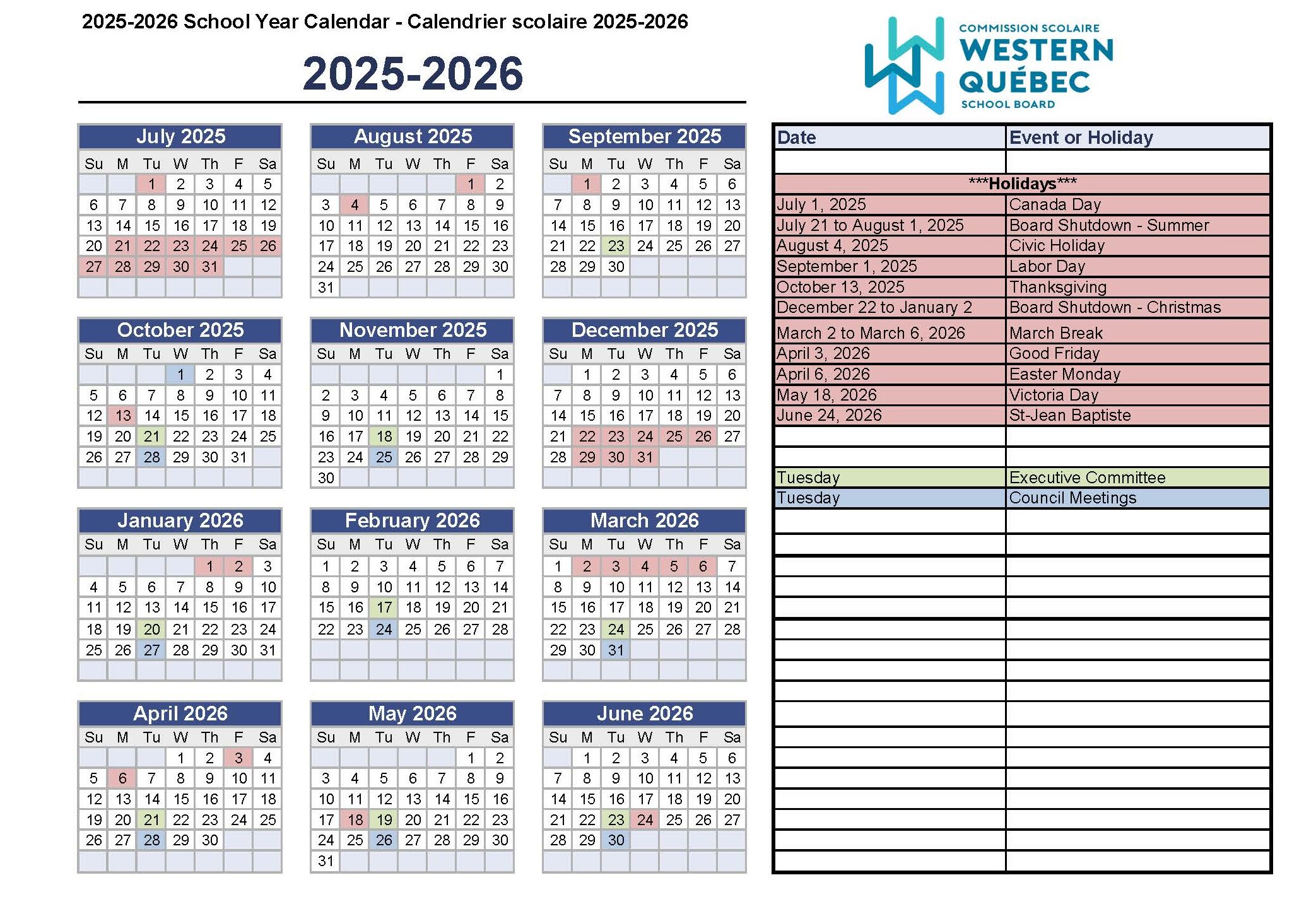 School Board Calendar 2025-2026